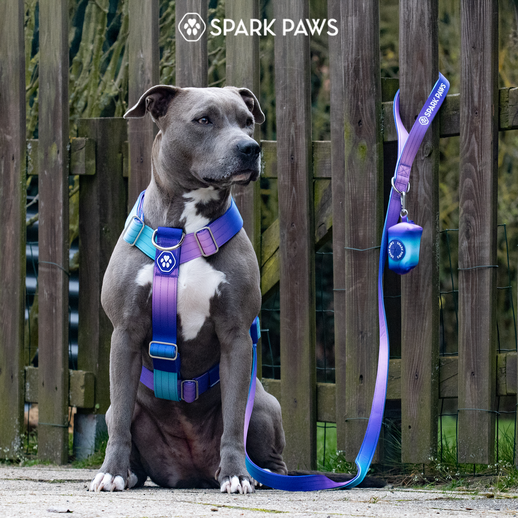 Each set comes with a No-Pull Dog Harness, a matching Neoprene Leash and a Poop bag carrier.